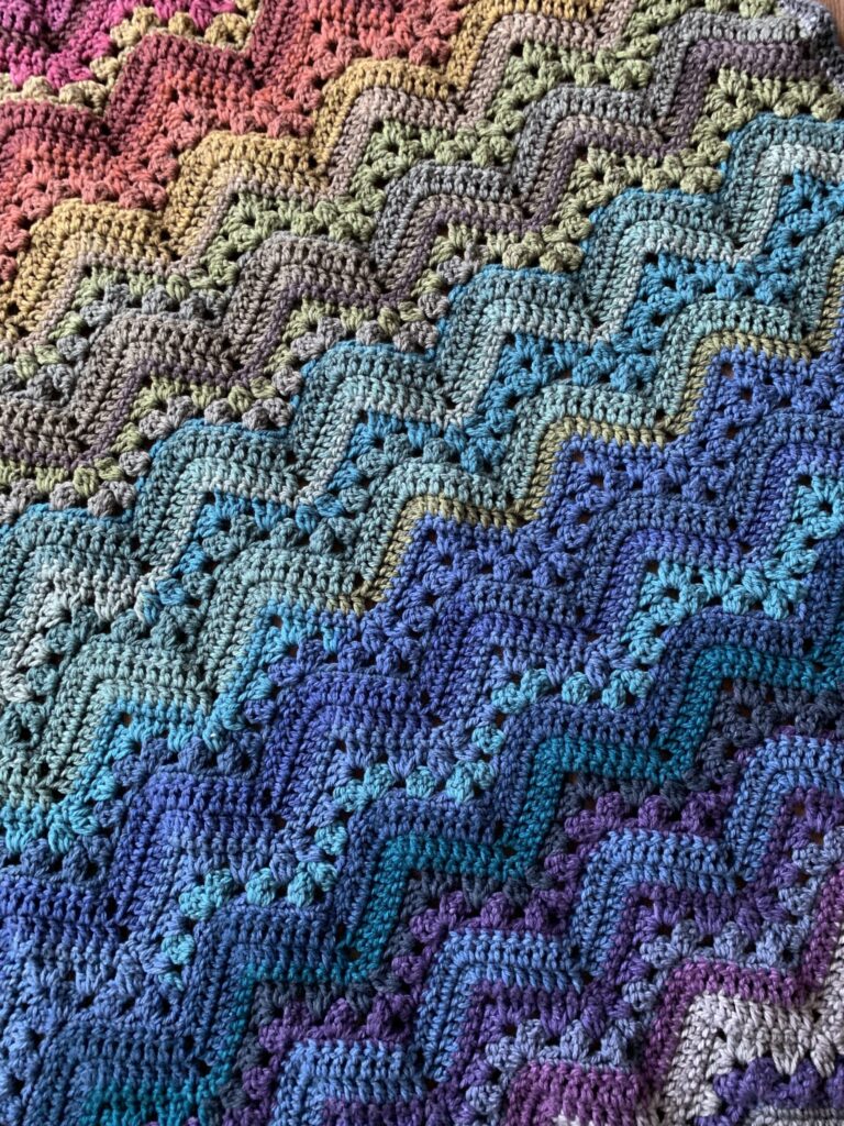 I only had time to work on projects for a couple of hours at night in my down time, in front of tv shows or movies before going to bed. I was able to complete the blanket for my grand-nephew in six easy days of crochet.